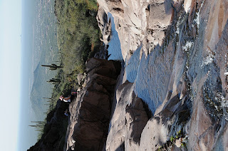 Quikrete is pretty handy stuff and it’s a good thing that some enterprising mountaineer used the instant cement mix to create footholds and a secured boulder where bare rock goes vertical on Picket Post Mountain. The little Quikrete ledges reduce the risk of plunging over ocotillo and hedgehog cacti into stony oblivion. But the little cheater steps aren’t visible from the trailhead; which is why, at first glance, the hill looks insurmountable. Once on the trail, though, the chutes and gullies that stair step to the top become apparent.